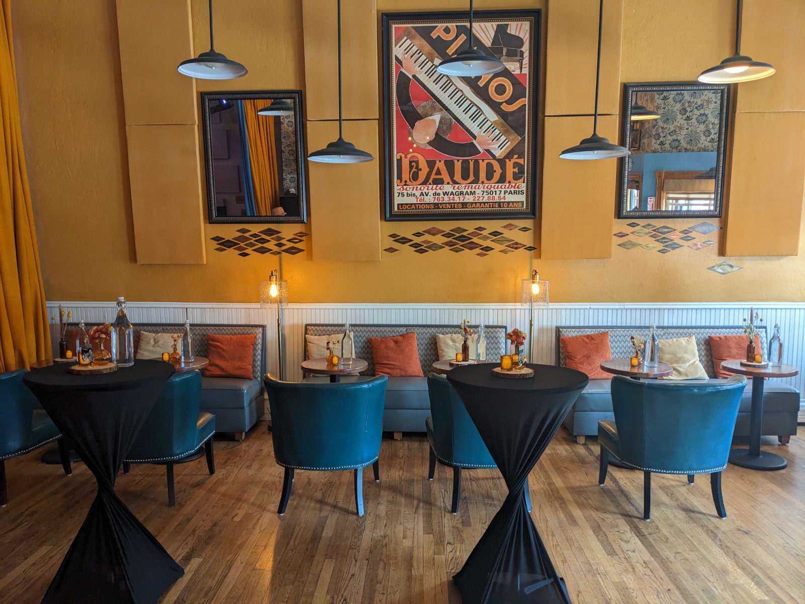 The Sherbino Theater is a 3,200 square foot building that includes open, flexible space, a bar, a stage and a backstage area. The “open floor” is approximately 1,700 square feet. Without chairs and tables, the room can host about 150 standing. With Chairs in tight rows, it can seat 120. We have 110 black folding chairs on-site as well as ten black 6’ folding tables, 10 round cocktail tables and four to eight small outdoor cafe tables with chairs (which are for outdoor/sidewalk use). The bar offers beer, wine, canned cocktails, limited mixed drinks and an assortment of candy, chips and sodas.